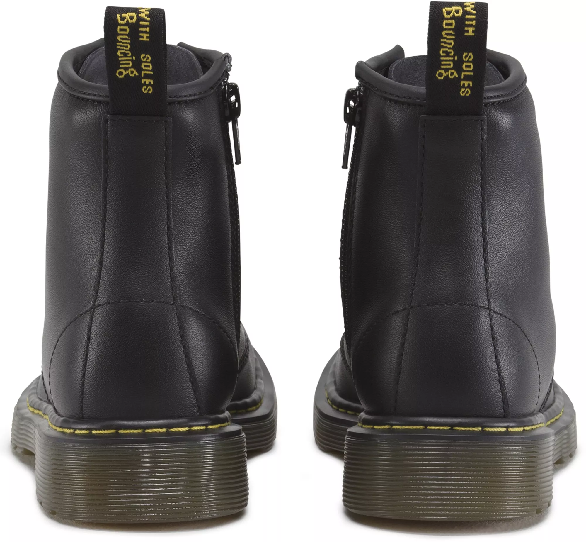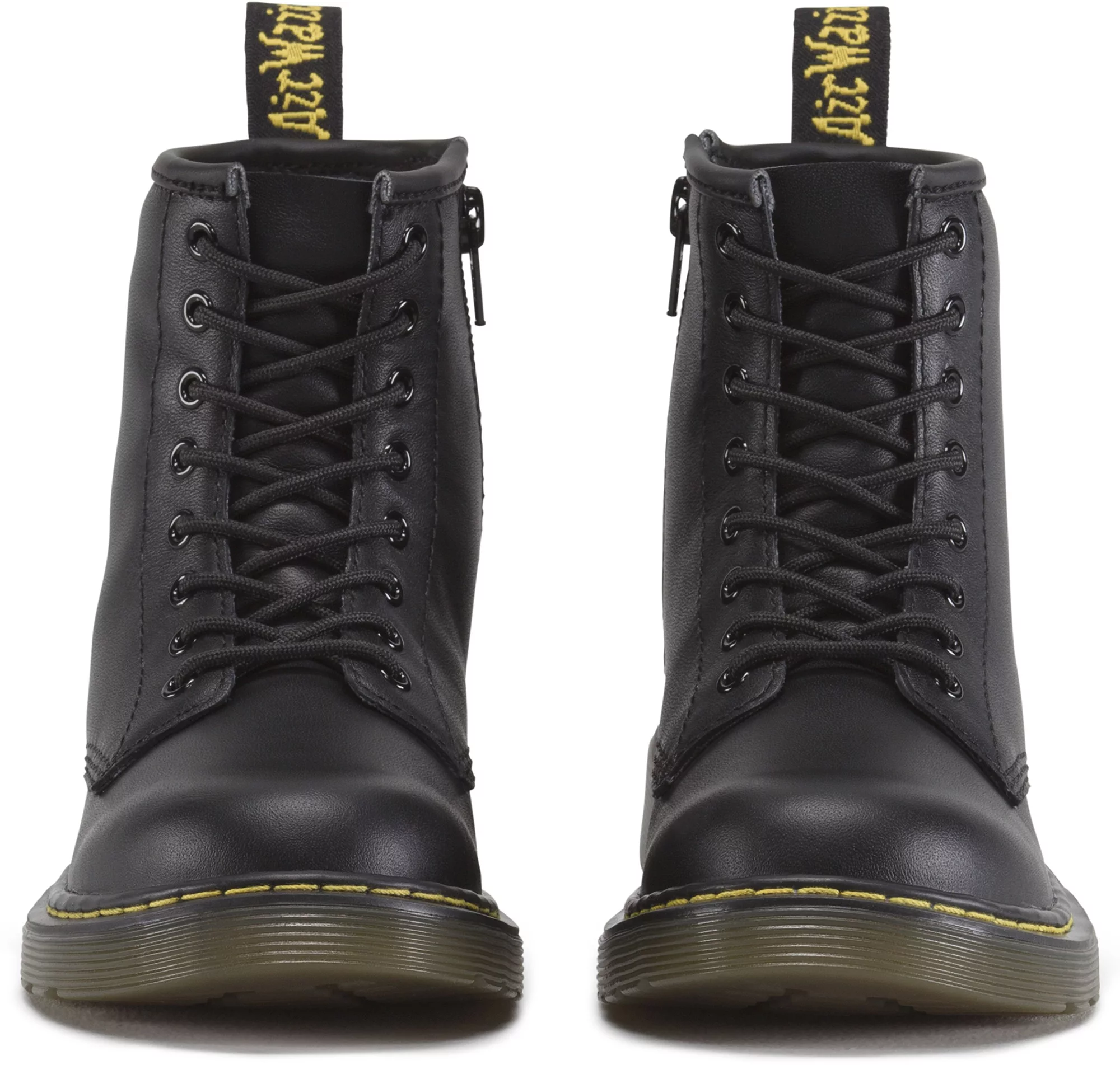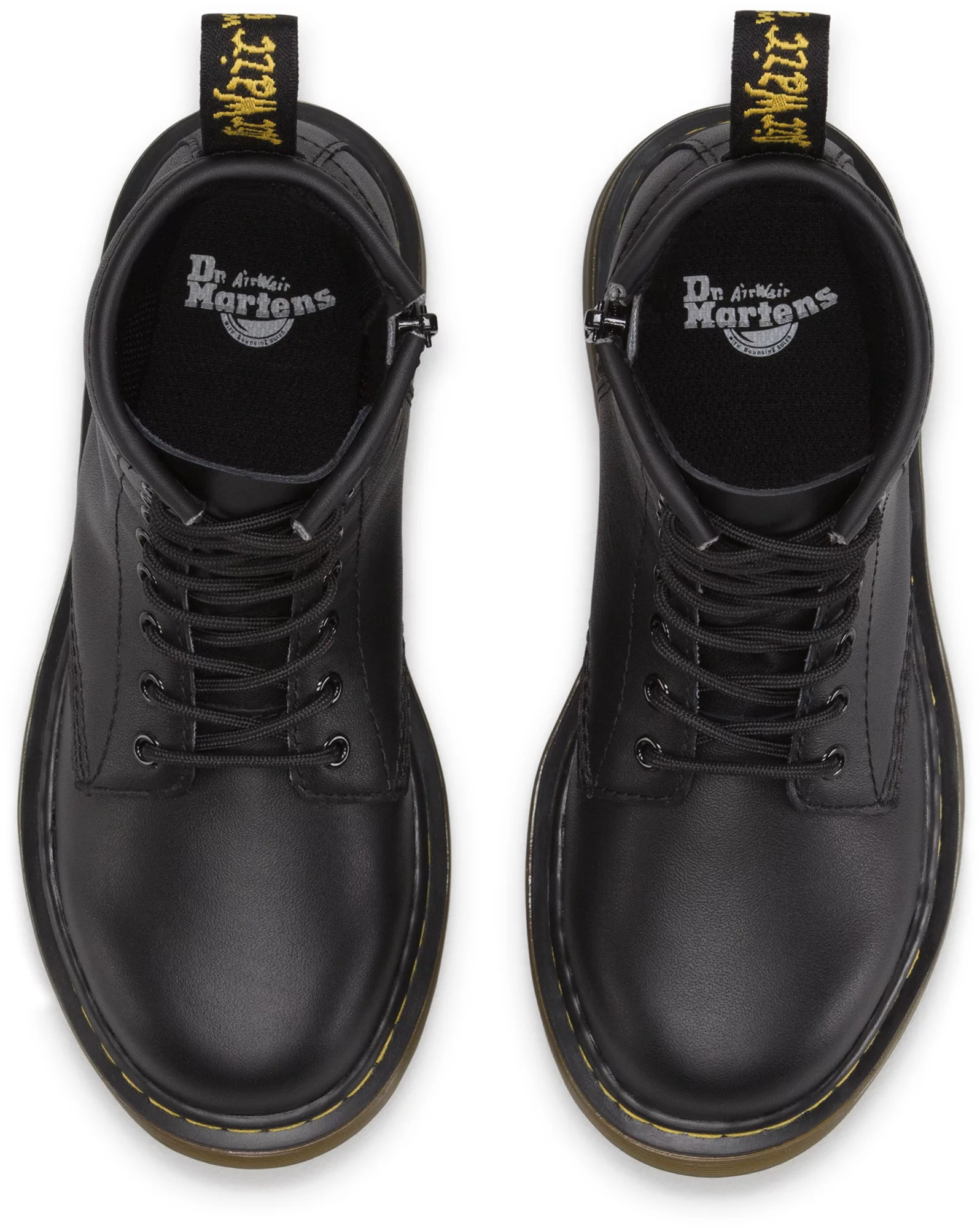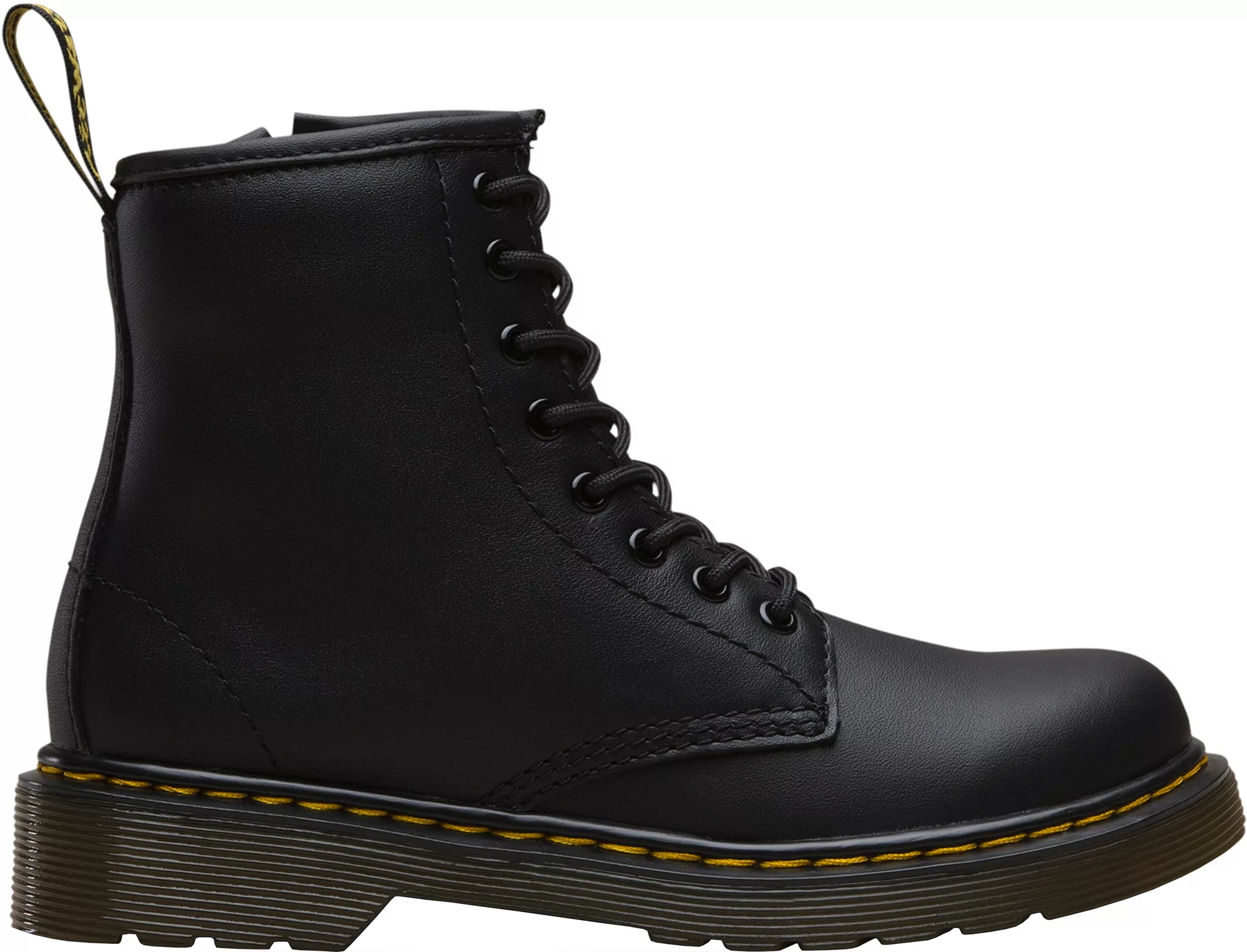 - Classic Dr. Martens® DNA with grooved edges, yellow stitching, and scripted heel loop