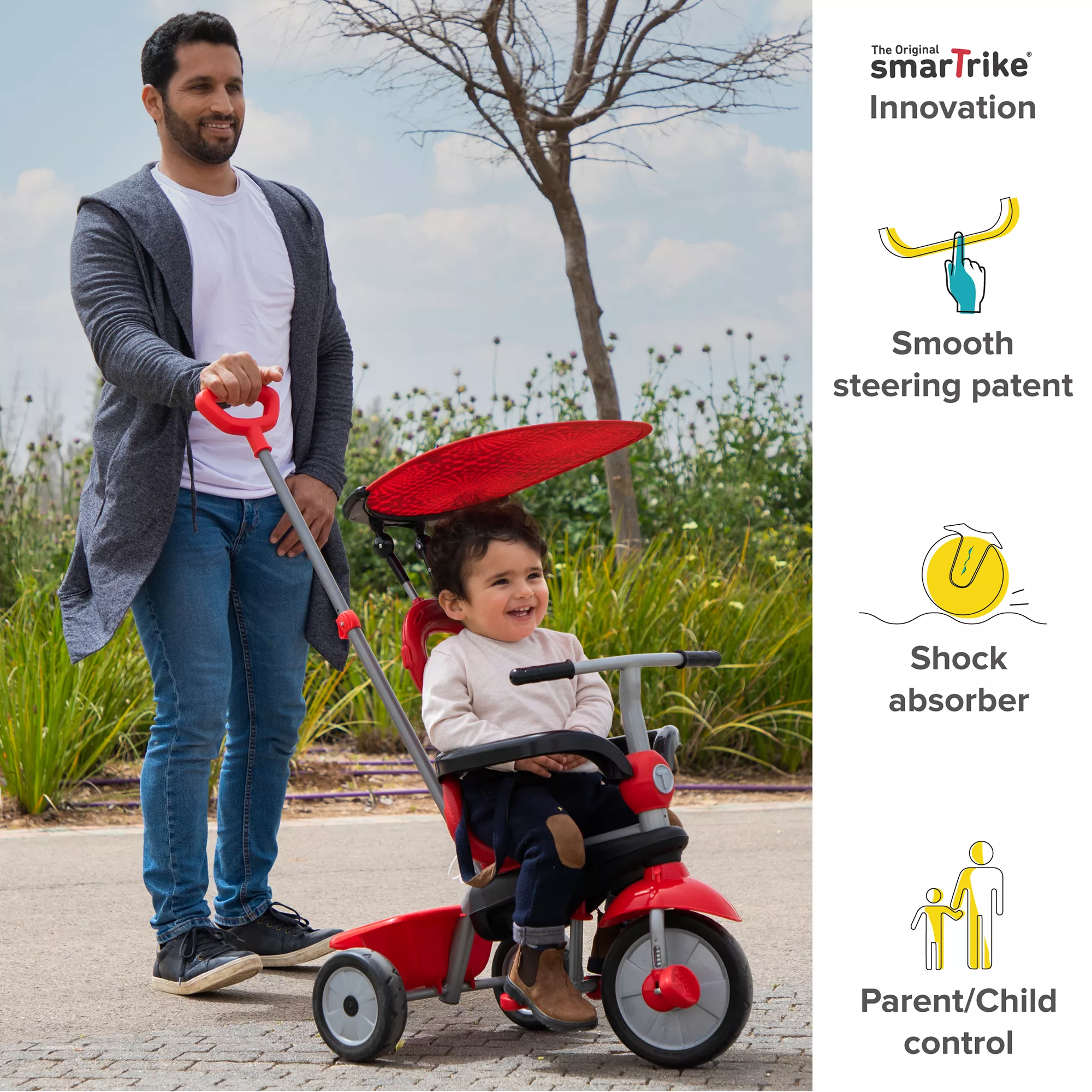 - Adjustable, detachable parent push handle and parent control button for customized control